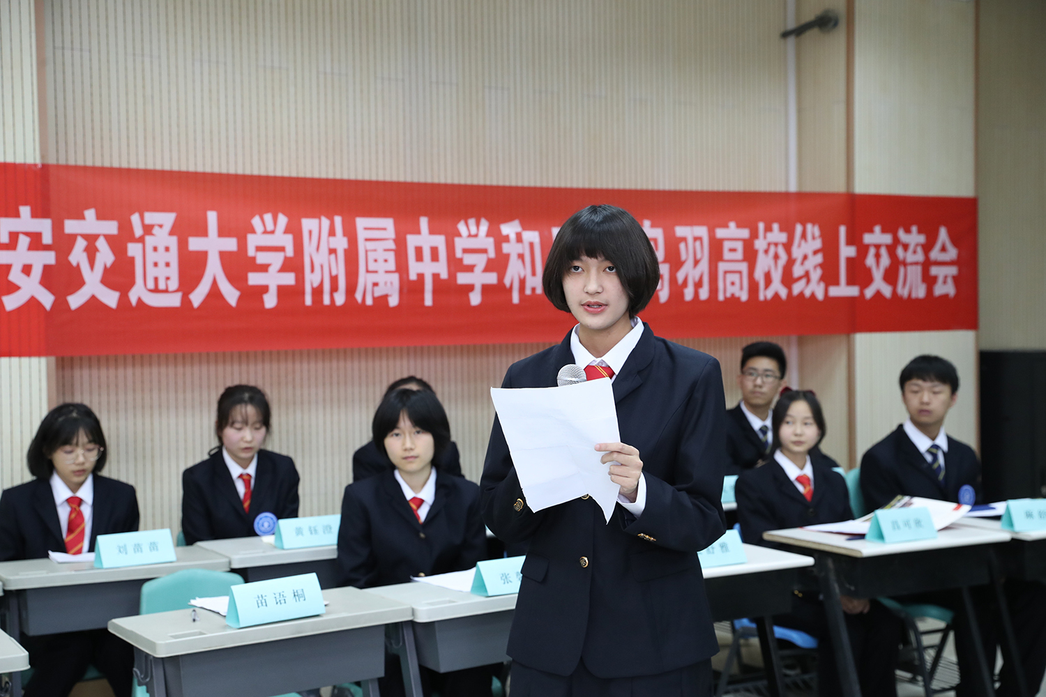 交流活动在双方学生代表致辞和两校学生自我介绍后正式开始。鸟羽高中的学生介绍了自己的学校, 京都府鸟羽高中是位于京都市南区的一所公立全日制高中,其前身为1900年设立的京都府第二中学,该校实行文体成绩出色,注重国际化发展。