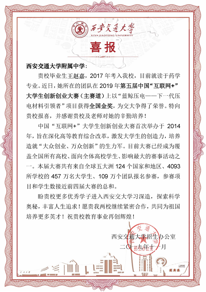 2017届校友王赵嘉,她所在的团队在 2019 年第五届中国“互联网+” 大学生创新创业大赛(主赛道)上以“蓝鲸压电——下一代压电材料引领者”项目获得全国金奖。