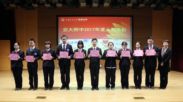 德育处曹浜主任宣布了关于对2017—2018学年第二学期先进班集体的表彰决定,高三创新2班等21个班被评为先进班集体,高二4班等15个班为表扬班集体。之后,由团委学生会主持进行了“交大附中2017年度人物”颁奖仪式,这是我校首次开展的德育特色贡献先进学生评比活动,该表彰分为“楷模学生奖”、“品德风尚奖”、“领导力奖”、“服务明星奖”四个奖项,主要是对上个年度在文明礼仪、好人好事以及学生工作等方面有突出表现的优秀学生进行表彰。张颢继、杨镒锴、杨紫萌、袁丹诚等40名同学分别荣获这些奖项,王佩东校长、李阳副校长等领导为这些获奖的同学颁发了奖状和奖品。